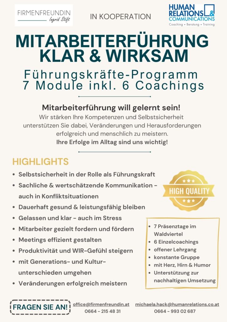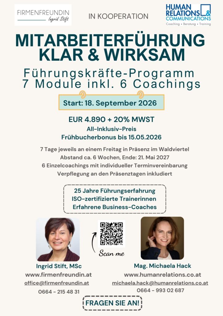 Das Programm umfasst einen Zeitraum von ca. 10 Monaten – damit bleibt zwischen den Modulen genügend Zeit, die Inhalte in die alltägliche Führungspraxis zu integrieren und das eigene Handeln zu reflektieren. Jedes Modul umfasst 1 Seminartag in Präsenz und ein 90-minütiges Coaching nach jedem Modul. Die Module werden von Fr. Mag. Michaela Hack und mir geleitet – unsere eigene fundierte Führungserfahrung bildet eine wichtige Basis.